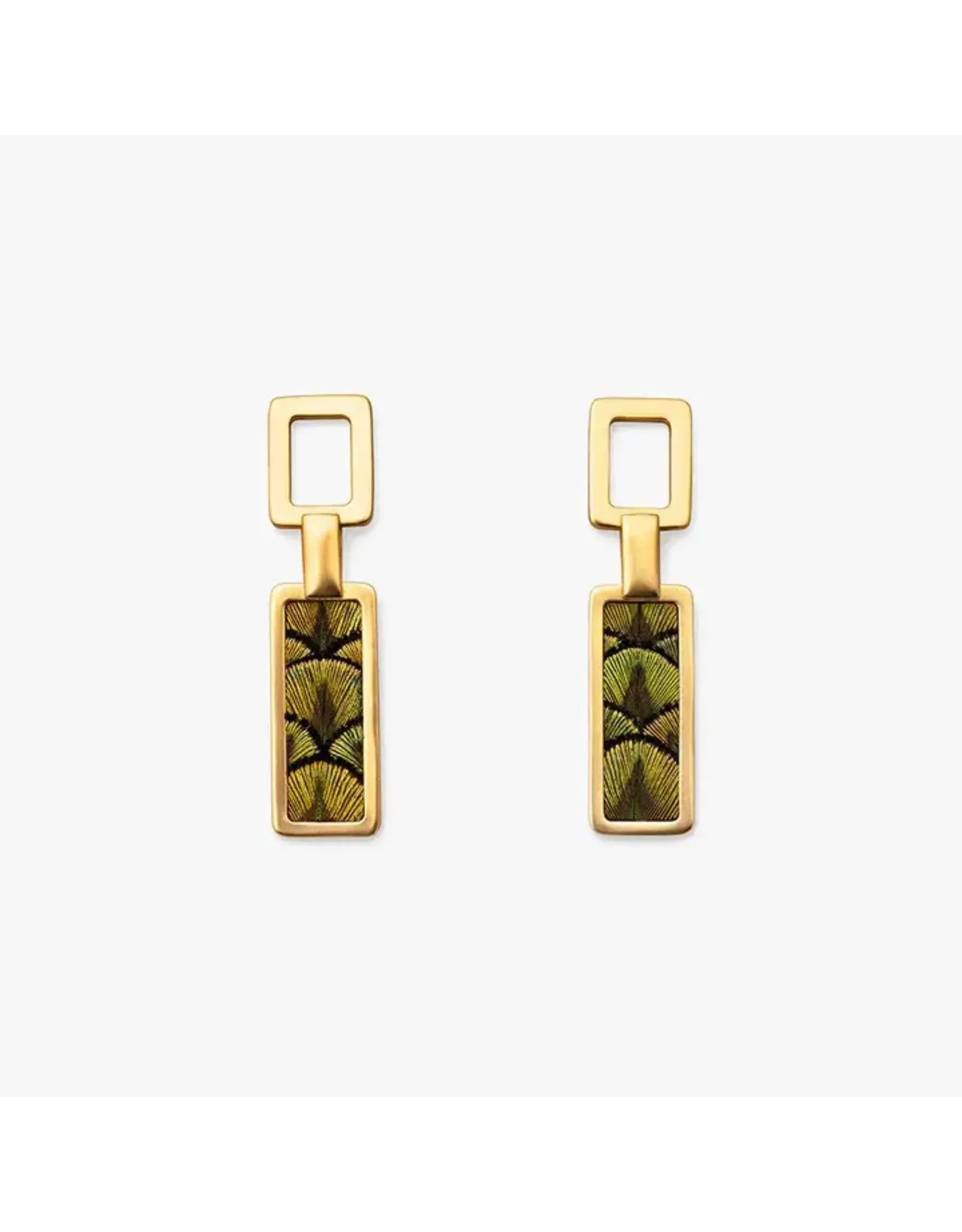 Coakley Town - Yellow and green peacock feathers in a fan pattern, set in an 18k gold plated frame. Earrings measure approximately 2.25" long and 0.5" wide.